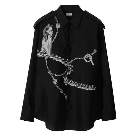 Burberry Mens Tops. Fashion category: T-Shirts & Henleys. SKU: 8089069. Color: Silver/Black. Burberry Knight Silk Shirt With Hand-Painted Design. An oversized long-sleeved shirt featuring hand-painted artwork of our jewelry and bag hardware. Includes a button closure, point collar, epaulettes, single-button cuffs, and a curved hem. 100% Silk. Made in Italy.