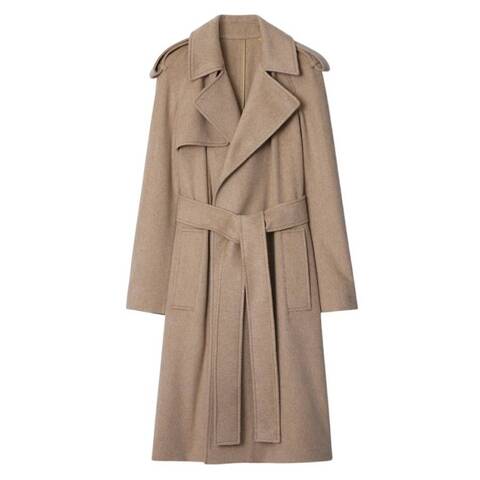 Burberry Ladies Outerwear. Fashion category: Coats & Jackets. SKU: 8093844. Color: Flax. Burberry Cashmere Wrap Belted Trench Coat. This wrap coat is crafted from double-faced cashmere and inspired by Burberrys heritage trench. The lightweight, unlined design is tailored to a relaxed fit with raglan sleeves and features epaulettes, a self-tie belt, side welt pockets, and a back vent for an elegant, effortless silhouette. 100% cashmere. Sleeve lining: 100% viscose.