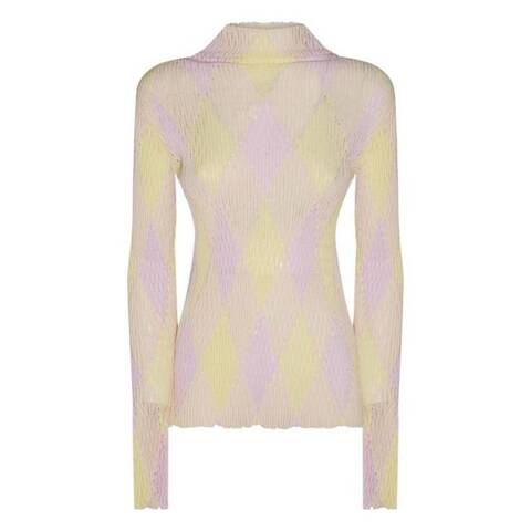 Burberry Ladies Tops. Fashion category: Cardigans & Sweaters. SKU: 8081047. Color: Cameo Ip Pattern. Burberry Argyle Cotton Silk Turtleneck Sweater. This turtleneck sweater is crafted from a cotton-silk blend and features a classic argyle knit pattern. It has a slim fit, long sleeves, and a high neckline for a refined, elegant look. 60% cotton, 40% silk. Made in Italy.