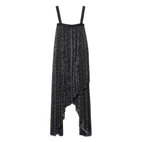 Burberry Ladies Dresses. Fashion category: Casual Dresses. SKU: 8088623. Color: Silver/Black. Burberry Pleated Chain Print Dress. This mid-length shift dress features a fully pleated design with a chain-link print. It has a square neckline, is sleeveless, and is finished with an asymmetric hem for a modern, elegant silhouette. Polyester 100%. Made in Italy.