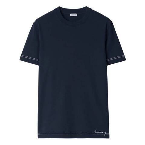 Burberry Mens Tops. Fashion category: T-Shirts & Henleys. SKU: 8094777. Color: Storm. Burberry Logo Embroidered Cotton T Shirt. This shirt features striking contrast stitching and a logo-embroidered edge, complemented by a classic crew neck, short sleeves, and a straight hem, creating a polished yet effortlessly stylish design. 100% Cotton.