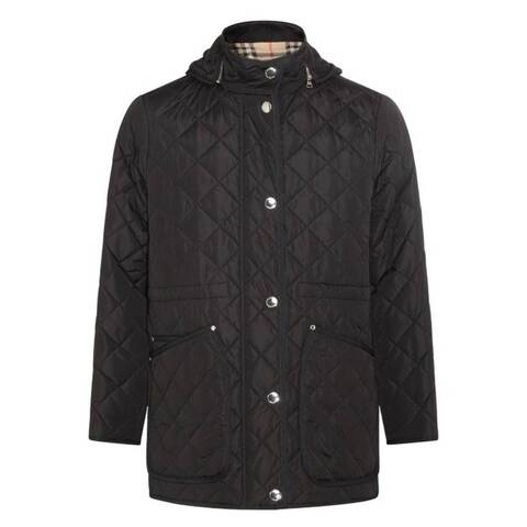 Burberry Ladies Outerwear. Fashion category: Coats & Jackets. SKU: 8070967. Color: Black. Burberry Roxbugh Nylon Quilted Jacket. This jacket features a detachable hood at a stand collar and a two-way zip with press-stud closure. It includes patch pockets, an embroidered logo on the front pocket, a concealed drawstring at the waist, and press-stud vents at the side seams and cuffs. The interior has a patch pocket, and the jacket is fully lined in satin with a signature check pattern. Outer: 100% Nylon. Padding: 90% down, 10% feather.
