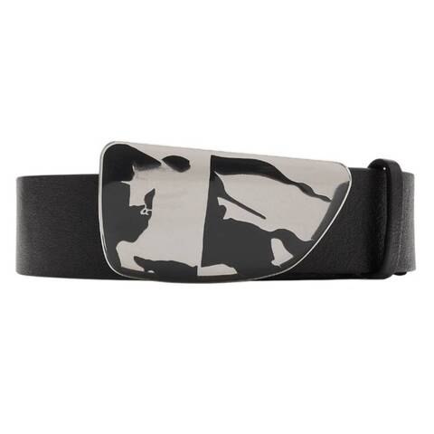 Burberry Mens Belts. Fashion category: Belts. SKU: 8087287. Color: Black. Burberry Shield EKD Buckle Leather Belt. An Italian-made belt crafted from grainy calf leather, finished with a distinctive folded shield buckle detailed with an enamelled Equestrian Knight Design. Hand-painted edges complete the refined look. 3.5cm/1.4in wide. Outer: 100% calf leather. Made in Italy.
