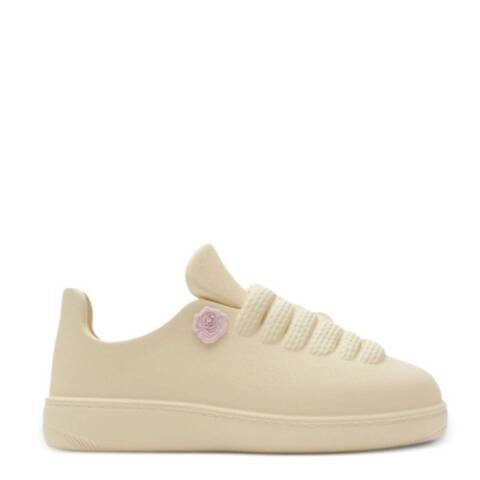Burberry Ladies Sneakers. SKU: 8103961. Color: Clay. Burberry Womens Clay Bubble Slip-On Sneakers. Crafted from white EVA, these shoes are accented with detachable rose and Equestrian Knight logo charms for a distinctive finish. They feature the signature Equestrian Knight motif, a floral applique, and a round toe, complemented by a faux lace-up design. An EVA midsole and flat sole provide lightweight comfort and everyday practicality. Made in Italy. <br/><br/><b>Please visit the brand website for sizing information.</b>