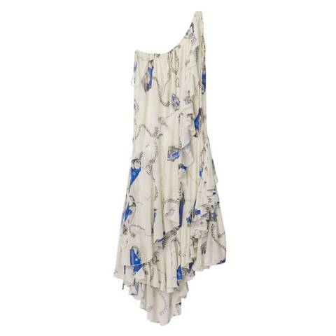 Burberry Ladies Dresses. Fashion category: Casual Dresses. SKU: 8088615. Color: Blue/White. Burberry Knight Hardware One-Shoulder Dress. This one-shoulder dress is crafted from crepe jersey and printed with hand-painted artwork inspired by Burberrys jewellery and bag hardware. The lightweight silhouette features layered ruffles and an asymmetric hem, designed in a regular fit for effortless elegance. Outer: 100% viscose. Made in Italy.