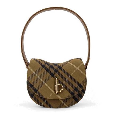 Burberry Ladies Crossbody. SKU: 8098222. Barcode: 5045707675194. Color: Furrow Ip Check. Size: 8.3 x 3.9 x 7.5in. Burberry Small Rocking Horse Bag. This structured saddle bag is made from a water-repellent cotton-blend fabric jacquard-woven with the iconic Burberry Check and fully lined in smooth leather. Its curved silhouette and arched profile are enhanced by strap prongs inspired by traditional equestrian rein hardware, while the signature b pivot closure secures the foldover flap with a distinctive finish. Designed for versatility, the adjustable leather strap allows it to be worn over the shoulder or styled crossbody, and it is complete with interior and exterior slip pockets, hand-painted edges, and brushed metal hardware for a refined, polished look. Material: 65% polyester, 35% cotton. Made in Italy.