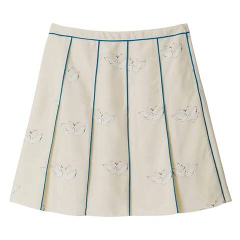 Burberry Ladies Bottoms. Fashion category: Skirts. SKU: 8094979. Color: Soap Ip Pattern. Burberry Silk Swan Pleated Skirt. This skirt features an all-over pleated design with a whimsical graphic print of birds gliding across a silky surface. It has a side zip fastening and a straight hem for a polished finish. 100% Mulberry Silk.