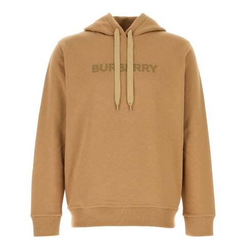 Burberry Mens Tops. Fashion category: Hoodies & Sweatshirts. SKU: 8096364. Color: Camel. Burberry Ansdell Logo Print Cotton Hoodie. This hoodie is crafted from organic loop-back cotton and features a drawcord hood and long sleeves. It is finished with printed Burberry lettering at the front for a subtle branded detail. 100% Cotton.