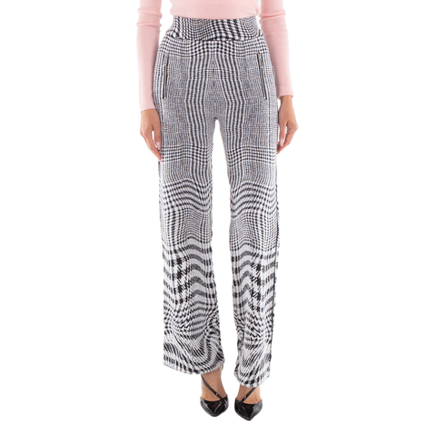 Burberry Ladies Bottoms. Fashion category: Pants & Leggings. SKU: 8083681. Color: Monochrome Ip Pttn. Burberry Warped Houndstooth Jacquard Wool-blend Trousers. Monochrome, woven with twisted thousand bird pattern jacquard, loosened waist and side zipper pocket. 56% Wool 29% Polyester 14% Polyamide, 1%Elastane. Made in Italy.