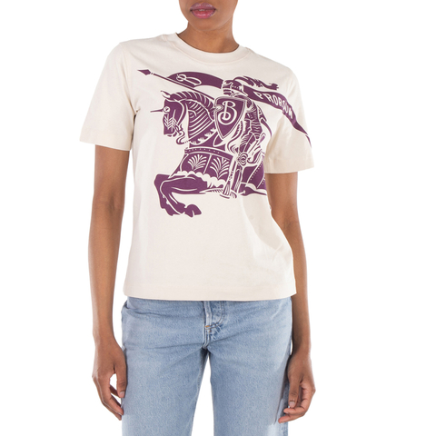 Burberry Ladies Tops. Fashion category: T-Shirts & Henleys. SKU: 8096379. Material: Cotton. Color: Soap/Pansy. Burberry Logo Printed Cotton T-Shirt. This t-shirt features an Equestrian Knight print and a rib-knit neckline. 100% cotton, Trim: 97% cotton, 3% elastane. Made in Portugal.