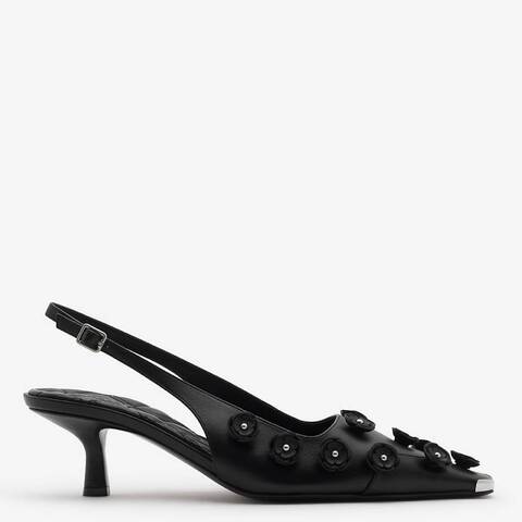Burberry Ladies Heels. SKU: 8096149. Color: Black. Shoe Style: Heels. Burberry Flora Leather Chisel Slingback Pumps. These Italian-made slingback pumps feature smooth leather, a metal B at the toe, and hand-applied leather roses with studs. The padded quilted insole ensures comfort, while the embossed Equestrian Knight Design adorns the sole. They also have an adjustable strap, squared toe, kitten heel, and come with a dust bag. Heel height: 5cm/2in . Upper: 90% lambskin, 10% brass. Lining: 60% sheep leather, 40% lambskin. Heel: 100% lambskin. Sole: 100% leather. Made in Italy. <br/><br/><b>Please visit the brand website for sizing information.</b>