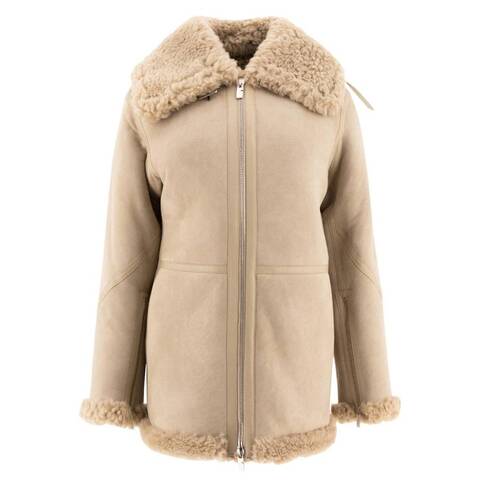 Burberry Ladies Outerwear. Fashion category: Coats & Jackets. SKU: 8095510. Color: Field. Burberry Shearling Aviator Jacket. This Italian-made shearling aviator jacket is crafted with an oversized collar and tonal leather taping for a luxe finish. Cut to a relaxed fit, it features a two-way zip closure, a double-strap B buckle throat latch, zip cuffs, and convenient side slip pockets, combining functionality with classic aviator style. 100% real farmed dyed lamb shearling. Trim: 100% calf leather. Made in Italy.