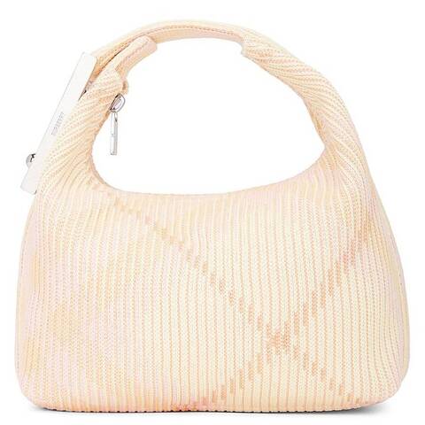 Burberry Ladies Duffle Bag. SKU: 8082041. Color: Sherbet. Size: 8.5 x 4.1 x 9.1in. Burberry Mini Peg Check Duffle Bag. This structured bag, crafted in Italy, features the iconic Burberry Check in a soft, knitted design. Lightweight and unlined, it is finished with a curved top handle secured by a logo-engraved peg clip. The bag is completed with a zip closure, brushed metal hardware, and subtle engraved Burberry lettering on the peg for a refined, elegant touch. 100% polyamide. Trim: 57% polyester, 43% polyurethane. Made in Italy.