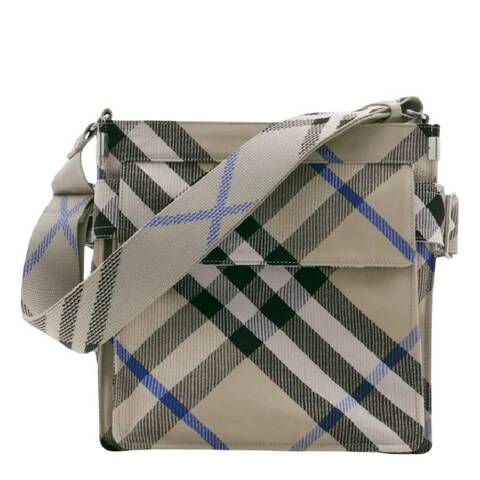 Burberry Mens Crossbody. SKU: 8095012. Color: Lichen. Size: L: 3.34 x H: 11.41 x W: 11.41. Burberry Small Trench Check Pattern Crossbody Bag. This bag is crafted from patterned jacquard with a check design and features the signature B buckle. It is detailed with logo-engraved silver-tone hardware, an adjustable shoulder strap, and an open top. Additional features include a front flap pocket, a rear flap pocket, a main compartment, and an internal zip-fastening pocket. Material: 65% Polyester, 35% Cotton. Made in Italy.