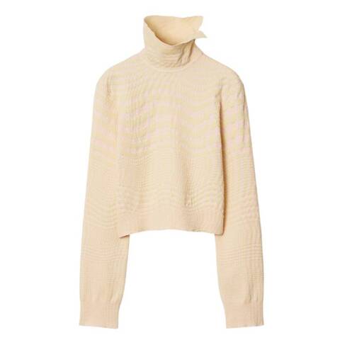 Burberry Ladies Tops. Fashion category: Cardigans & Sweaters. SKU: 8080887. Color: Cameo Ip Pattern. Burberry Warped Houndstooth Turtleneck Sweater. This turtleneck sweater is crafted from a stretch wool blend and jacquard-woven with a warped houndstooth pattern. Designed in a regular fit, it features long sleeves for a refined, modern look. 58% wool, 28% polyester, 13% polyamide, 1% elastane. Made in Italy.