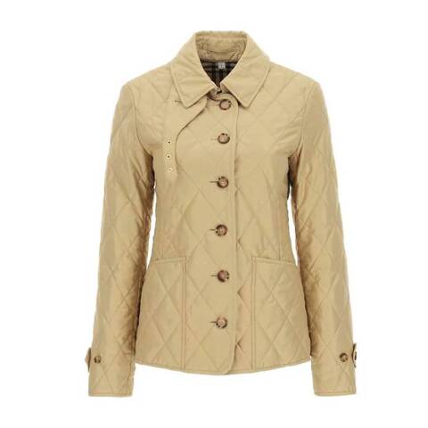 Burberry Ladies Outerwear. Fashion category: Coats & Jackets. SKU: 8023321. Color: New Chino. Burberry Womens Diamond Quilted Thermoregulated Jacket. The Fernleigh jacket is tailored to a slim fit and features a diamond-quilted design, crafted from padded technical polyester with thermoregulation technology for enhanced breathability. It is styled with a single-breasted horn-button closure, patch pockets, button-tab cuffs, a throat latch, and a hook-and-eye collar fastening. The interior is lined in Vintage Check fabric and includes a pocket for added functionality.