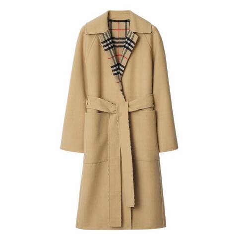 Burberry Ladies Outerwear. Fashion category: Coats & Jackets. SKU: 8093825. Color: Flax. Burberry Reversible Check Wool Long Car Coat. A versatile wool car coat that reverses from a solid tone to the iconic Burberry Check, offering two distinctive looks in one. Softly tailored to a regular fit, it features a wrap closure and a belt to adjust the silhouette for a personalized fit. Designed with long sleeves, side welt pockets, and reverse patch pockets. 100% Virgin Wool. Made in Italy.