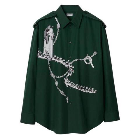 Burberry Mens Tops. Fashion category: Casual Button-Downs. SKU: 8089071. Color: Silver/Green. Burberry Knight Hardware Printed Cotton Shirt. This long-sleeved shirt is tailored from cotton poplin and cut to an oversized fit. It is printed with hand-painted artwork inspired by Burberrys jewellery and bag hardware, and features a button-front closure, point collar, epaulettes, single-button cuffs, and a curved hem. 100% cotton.