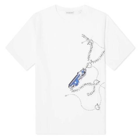 Burberry Mens Tops. Fashion category: T-Shirts & Henleys. SKU: 8089334. Color: Knight Ip Pattern. Burberry Knight Hardware Printed Cotton T-Shirt. This cotton jersey T-shirt is cut to a regular fit and printed with hand-painted artwork inspired by Burberrys jewellery and bag hardware. It features a classic crew neckline, short sleeves, and a straight hem. 100% cotton. Made in Portugal.