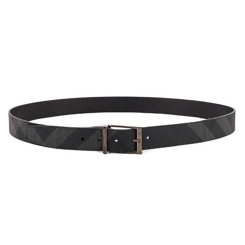Burberry Mens Belts. Fashion category: Belts. SKU: 8065344. Color: Charcoal/Graphite. Size: One Size. Burberry Louis 35 Check Reversible Belt. The Burberry Louis belt offers versatile style, reversing from the iconic woven check pattern to smooth leather. Finished with hand-painted edges, it is secured by a logo-engraved buckle and features engraved Burberry lettering for a polished, signature touch. 100% Calf Leather, 70% Thermoplastic Polyurethane (TPU), 30% Cotton. Made in Italy.