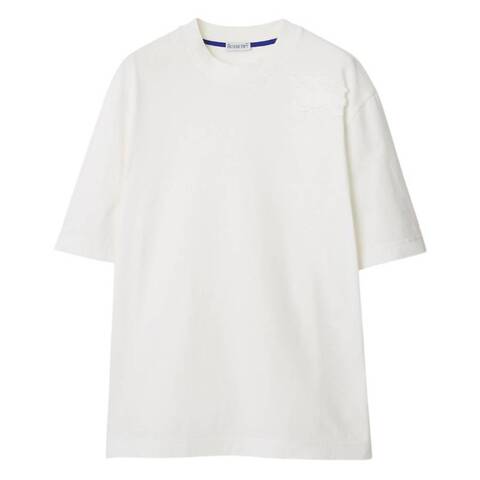 Burberry Ladies Tops. Fashion category: T-Shirts & Henleys. SKU: 8084966. Color: Salt. Burberry Crew-Neck Cotton Jersey T-Shirt. This cotton jersey T-shirt from Burberry features a relaxed fit and a tonal Equestrian Knight Design applique at the front. Part of Burberry Classics, it is finished with a rib-knit crew neckline for a comfortable and timeless look. 100% cotton. Trim: 97% cotton, 3% elastane. Made in Portugal.