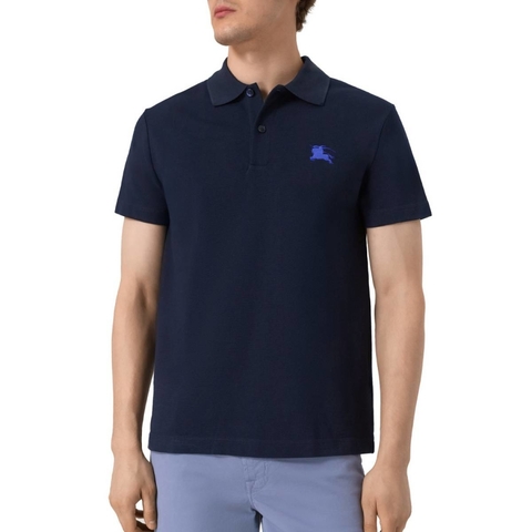 Burberry Mens Tops. Fashion category: Polo Shirts. SKU: 8107450. Color: Navy. Burberry EKD Embroidered Cotton Polo Shirt. This cotton polo shirt features the signature Equestrian Knight motif embroidered on the left chest, adding a refined, iconic detail. Designed with a classic polo collar, short front button fastening, short sleeves, and a straight hem. 100% Cotton. Made in Italy.