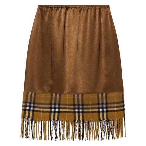 Burberry Ladies Bottoms. Fashion category: Skirts. SKU: 8098591. Color: Camp. Burberry Satin and Check Scarf Skirt. Crafted in Italy from lightweight viscose satin, this skirt showcases a degrade design inspired by the iconic Burberry Check scarf. The piece is seamlessly finished with cashmere-wool fringing, crafted using a textured needle-punch technique for added depth and movement. An elasticated waistband ensures a comfortable fit. 100% Viscose. Trim: 85% Wool, 15% Cashmere. Made in Italy.