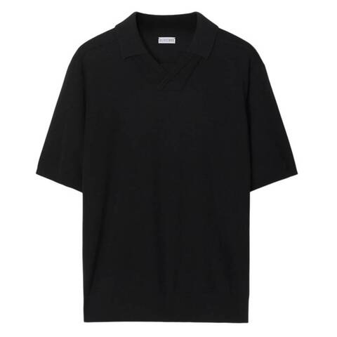 Burberry Mens Tops. Fashion category: Polo Shirts. SKU: 8083180. Color: Black. Burberry V-Neck Wool Polo Shirt. This polo shirt is crafted from Italian-woven wool and cut to a regular fit. Designed with a rib-knit collar and a V-neckline, it features short sleeves and a straight hem for a refined, modern look. 100% Wool.