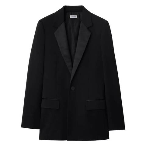 Burberry Ladies Outerwear. Fashion category: Blazers. SKU: 8101135. Color: Black. Burberry Grain De Poudre Wool Blazer Jacket. A blazer jacket crafted in Italy from refined grain de poudre wool, elevated with peaked lapels and contrasting silk satin trims for a sophisticated finish. Designed in a single-breasted, single-button silhouette, it features a half-canvas construction that provides a lightly structured, tailored shape. Classic detailing includes a chest welt pocket, side flap pockets, buttoned cuffs, and a single vent. 100% Wool.