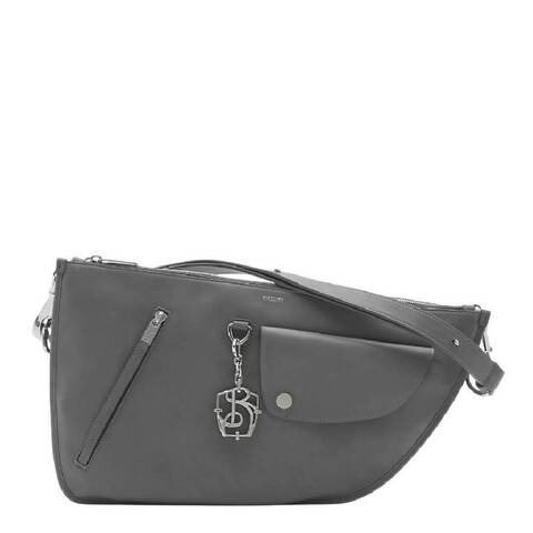 Burberry Ladies Hobo. SKU: 8097419. Color: Cobble. Size: L: 16.9 x H: 9.8 x W: 2. Burberry Shield Twin Leather Shoulder Bag. This bag is crafted from smooth calf leather and features a detachable, adjustable strap for versatile wear. It has a secure zip closure, two exterior zip compartments, and a central open-top compartment for easy access. Additional details include an exterior zip pocket, a press-stud flap pocket, and a detachable B charm. The design is enhanced with hand-painted edges, brushed metal hardware, and an embossed Equestrian Knight motif at the back, all lined in soft suede for a luxurious feel. Material: 100% Calf Leather. Made in Italy.