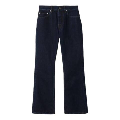 Burberry Ladies Bottoms. Fashion category: Jeans & Denim. SKU: 8105127. Color: Indigo. Burberry Classic Denim Flare Jeans. These jeans feature a hidden zipper and button closure, complemented by the classic five-pocket design and a sleek belt loop for added versatility. The back logo patch adds a refined touch, infusing the piece with subtle yet distinctive branding.