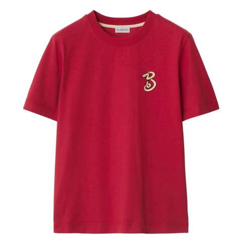 Burberry Ladies Tops. Fashion category: T-Shirts & Henleys. SKU: 8101396. Color: Geranium. Burberry B Snake Cotton T-Shirt. Crafted from soft cotton, this T-shirt is designed with a classic crewneck, short sleeves, and a straight hem. A signature B logo print at the chest adds a refined finishing touch. Cotton 100%.