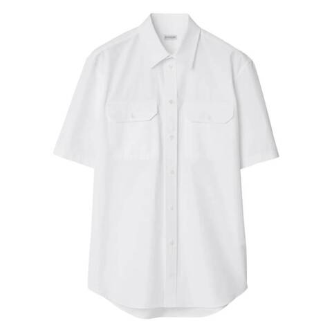 Burberry Mens Tops. Fashion category: Shirts & Blouses. SKU: 8087310. Color: White. Burberry Equestrian Knight Motif Cotton Poplin Shirt. This shirt is made from cotton twill weave and features a signature Equestrian Knight motif, front button fastening, a straight-point collar, short sleeves, two chest flap pockets, a curved hem and mother-of-pearl buttons. Cotton 100%. Made in Italy.