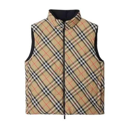 Burberry Mens Outerwear. Fashion category: Coats & Jackets. SKU: 8094236. Color: Sand Ip Check. Burberry Mens Reversible Check Nylon Padded Gilet. This relaxed-fit gilet is crafted from nylon and padded with goose down and feathers for lightweight warmth. The reversible design transitions from the Burberry Check to a solid color accented with an appliqued Equestrian Knight Design, combining versatility with signature style. Part of the Burberry Classics collection, it features a two-way zip closure, side zip pockets with reverse press-stud welt pockets, and an adjustable drawcord hem. 100% polyamide.