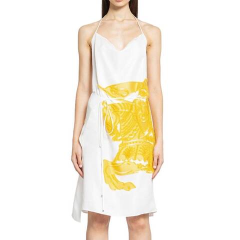 Burberry Ladies Dresses. Fashion category: Casual Dresses. SKU: 8090534. Color: Sunflower Ip Pattern. Burberry Womens Equestrian Knight Mini Dress. This mini dress showcasing the signature Equestrian Knight motif in a bold, artistic design. Cut in a fluid silhouette, the dress features a halterneck with delicate tie fastenings and a softly draped neckline. The open back enhances its elegant, modern appeal, while the lightweight fabric allows for graceful movement. Finished with a wrap-style skirt and an asymmetrical hem, this piece blends statement detailing with refined femininity.