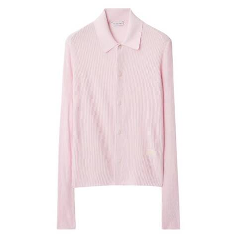 Burberry Ladies Tops. Fashion category: Shirts & Blouses. SKU: 8080904. Color: Cameo. Burberry Rib Knit Long-Sleeved Shirt. This long-sleeved shirt is made in Italy from gauzy rib-knit viscose and cut to a slim fit. It features a press-stud closure, a point collar, and an Equestrian Knight Design embroidered at the hem. 100% viscose. Made in Italy.