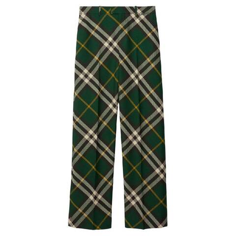 Burberry Mens Bottoms. Fashion category: Pants & Leggings. SKU: 8082273. Color: Ivy Ip Check. Burberry Tailored Check Pattern Wool Trousers. These tailored trousers are crafted from wool with a woven check pattern and are cut to a relaxed fit. They feature belt loops, a front zip pocket, and a pleated straight leg design. Outer: 100% wool, Lining: 100% viscose. Made in Italy.