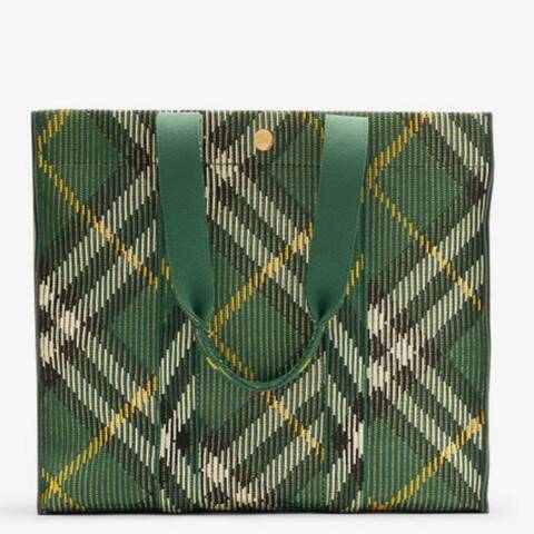 Burberry Ladies Tote. SKU: 8095786. Color: Ivy. Burberry Medium Check Knitted Tote. This softly structured tote showcases Burberrys iconic Check in a lightweight knitted design. Unlined for a minimalist feel, it is finished with a press-stud engraved with the signature Equestrian Knight Design, blending elegance with functional style. Details: Top handles for easy carrying. Press-stud closure with engraved Equestrian Knight Design. Interior zip pocket for essentials. Brushed metal hardware. Size & Fit: 40 x 17.5 x 36cm/15.8 x 6.9 x 14.2in. Handle drop: 25cm/9.8in. Fabric & Care: 100% polyamide. Trim: 53% cotton, 47% polyurethane. de in Italy.