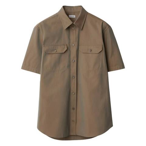 Burberry Mens Tops. Fashion category: Shirts & Blouses. SKU: 8087317. Color: Thicket. Burberry Equestrian Knight Motif Cotton Poplin Shirt. This shirt is made from cotton twill weave and features a signature Equestrian Knight motif, front button fastening, a straight-point collar, short sleeves, two chest flap pockets, a curved hem and mother-of-pearl buttons. Cotton 100%. Made in Italy.