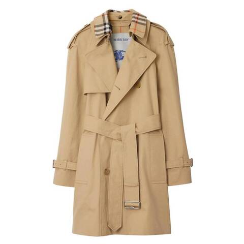 Burberry Ladies Outerwear. Fashion category: Coats & Jackets. SKU: 8094940. Color: Flax. Burberry Short Gabardine Belted Trench Coat. This trench coat is made from shower-resistant gabardine and tailored to a classic regular fit. It features a detachable jacquard-knitted collar in the iconic Burberry Check and a timeless double-breasted button closure. Finished with traditional epaulettes, a B-buckle belt, side welt pockets, belted cuffs, and a back vent, the design is completed with a Burberry Check undercollar and lining for a refined signature touch. Outer: 100% cotton. Collar: 82% viscose, 18% polyester. Made in Yorkshire, England.