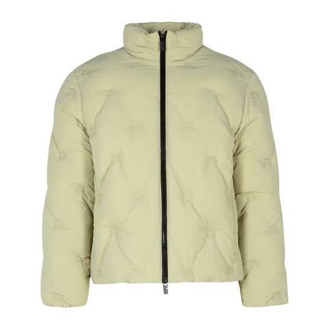 Burberry Ladies Outerwear. Fashion category: Coats & Jackets. SKU: 8094176. Color: Lichen. Burberry Womens EKD Nylon Puffer Jacket. Nylon puffer jacket filled with insulating goose down and feathers, detailed with the embroidered Equestrian Knight Design. Cut to a relaxed fit, the style features a packaway hood discreetly stored within the funnel neck for versatile wear. Part of the Burberry Classics collection, it combines everyday functionality with the brands signature aesthetic. Designed with a two-way zip closure, drawcord hood and hem for an adjustable fit, side zip pockets, and elasticated cuffs to help retain warmth. Material: 100% polyamide.