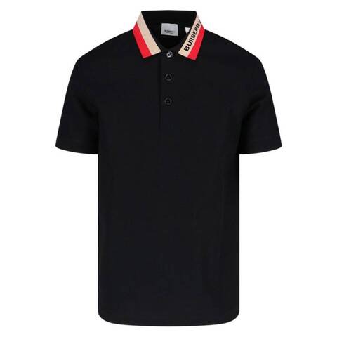 Burberry Mens Tops. Fashion category: Polo Shirts. SKU: 8083154. Color: Black. The Burberry Logo Intarsia-Knit Short Sleeved Polo Shirt offers a refined take on a timeless classic. Crafted from a soft cotton and elastane blend, it provides a comfortable fit with a touch of stretch. The neutral-toned base is complemented by understated accents in camel beige and crimson red at the collar, adding a hint of the brands iconic color palette. With short sleeves and a regular length. 100% Cotton. Made in Vietnam.