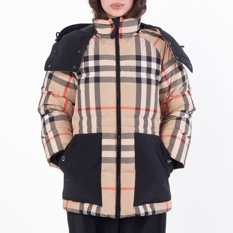 Burberry Ladies Outerwear. Fashion category: Coats & Jackets. SKU: 8059094. Burberry Checked Hooded Puffer Jacket Knee-length casual puffer jacket featuring Burberrys signature vintage check pattern. Designed with a removable hood, zip closure, long sleeves, and straight hem. Includes American-style pockets for practicality and a regular fit for everyday wear. Material: Shell: 100% Nylon; Lining: 100% Polyester; Fill: 90% Goose Down, 10% Feathers. Made in United Kingdom