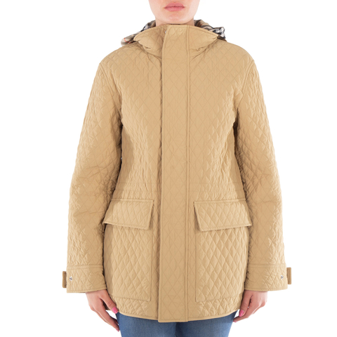 Burberry Ladies Outerwear. Fashion category: Coats & Jackets. SKU: 8093877. Color: Flax. Burberry Check Pattern Quilted Hooded Jacket. This quilted jacket features a vintage check pattern, a detachable hood, long sleeves with press-stud fastening cuffs, front flap pockets, a drawstring waist, a straight hem, and a concealed front zip fastening with press-stud closures. 100% Polyamide, 100% Polyester. Made in Italy.