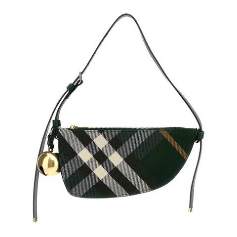 Burberry Ladies Belt Bag. SKU: 8088986. Color: Ivy. Size: L: 10.24 x H: 5.31 x W: 2.17. Burberry Check Print Shield Shoulder Bag. This shoulder bag is crafted from a cotton-blend fabric with a classic check print, featuring a removable bell charm, zip closure, and an adjustable shoulder strap for added convenience. Material: 65% Polyester, 35% Cotton. Made in Italy.