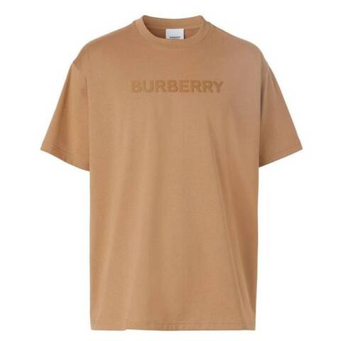 Burberry Mens Tops. Fashion category: T-Shirts & Henleys. SKU: 8055310. Color: Camel. Burberry Harriston Logo Print Cotton T-Shirt. This cotton jersey T-shirt features a relaxed fit with a classic crew-neck, short sleeves, and a straight hem. It is finished with printed Burberry lettering for a subtle branded touch. 100% Cotton. Made in Portugal.