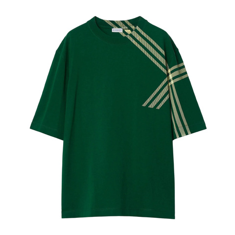 Burberry Mens Tops. Fashion category: T-Shirts & Henleys. SKU: 8082052. Color: Ivy. Burberry Check Pattern T-Shirt. This cotton t-shirt is made from jersey fabric and features a graphic print on the front and back shoulders, a check pattern, a round neck, short sleeves, and a straight hem. Cotton 100%