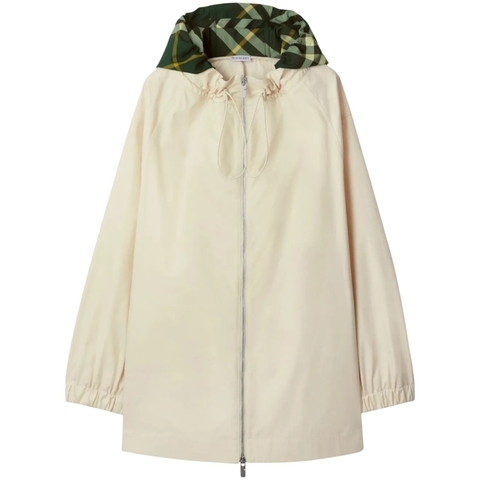 Burberry Ladies Outerwear. Fashion category: Coats & Jackets. SKU: 8083829. Color: Soap. Burberry Checkered Hood Long Sleeve Cotton Parka. This parka is crafted from cotton and features a classic check pattern. Designed with a slouchy drawstring hood, front zip fastening, long sleeves with elasticated cuffs, and a straight hem, it is fully lined for added comfort and warmth. Material: 100% Cotton.
