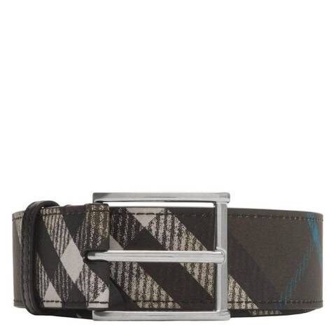 Burberry Mens Belts. Fashion category: Belts. SKU: 8106219. Color: Snug. Burberry Check Plaid Pin Buckle Belt. This Burberry belt features an all-over check design that brings a signature touch to any look. Crafted with an adjustable fit and secure buckle fastening, it is finished with an engraved logo for a refined, polished detail. 3.5cm/1.4in wide. 55% Polyurethane; 25% Polyester; 20% Cotton. Buckle: 100% brass with palladium plating. Made in Italy.