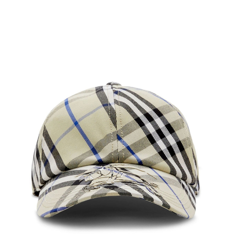 Burberry Mens Hats. Fashion category: Hats. SKU: 8085722. Material: Cotton;Polyester. Color: Lichen. Burberry Vintage Check Baseball Cap. This cap features a vintage check pattern, a curved screen, eyelets, the iconic Equestrian Knight logo, and a narrow, curved brim. 66% Polyester , 34% Cotton. Made in Italy.